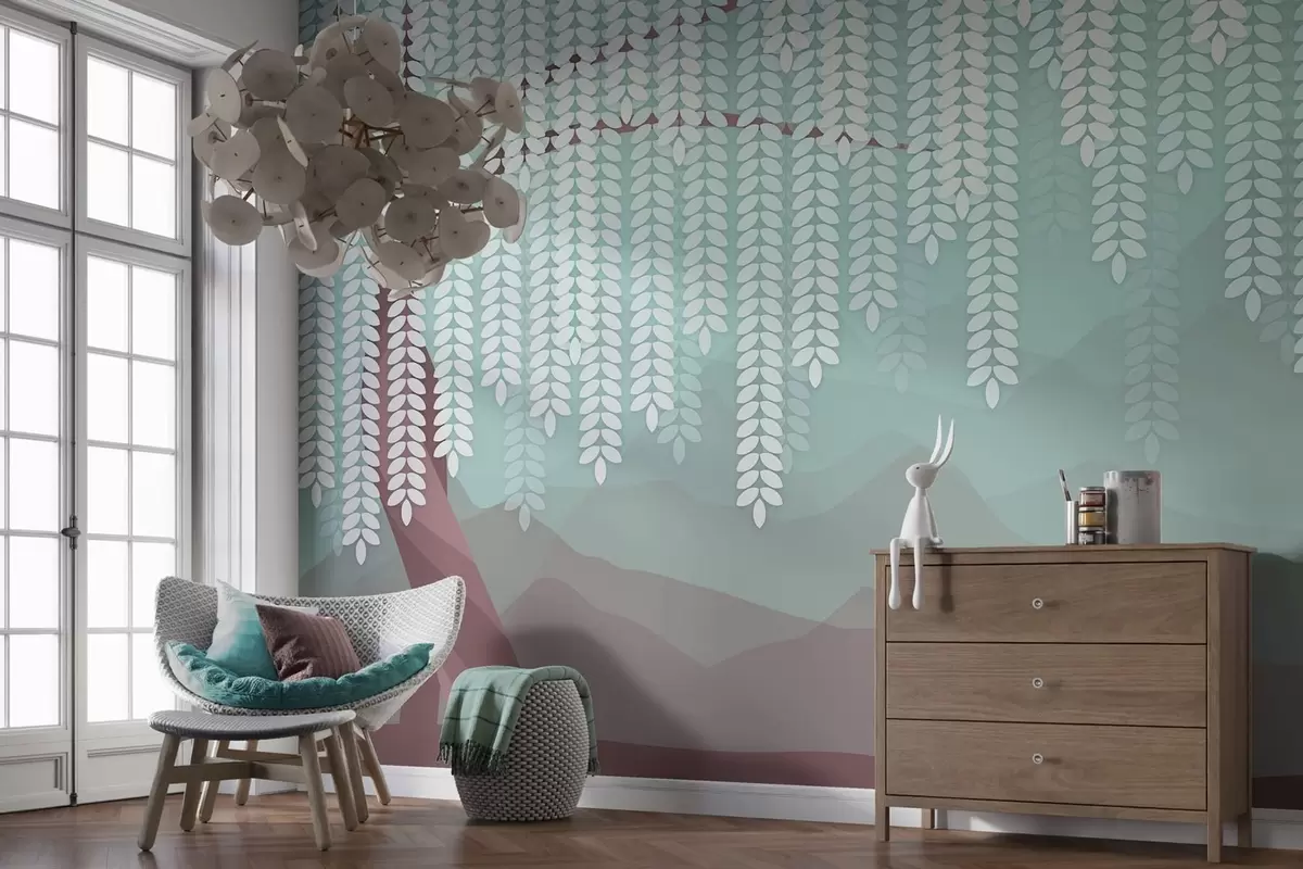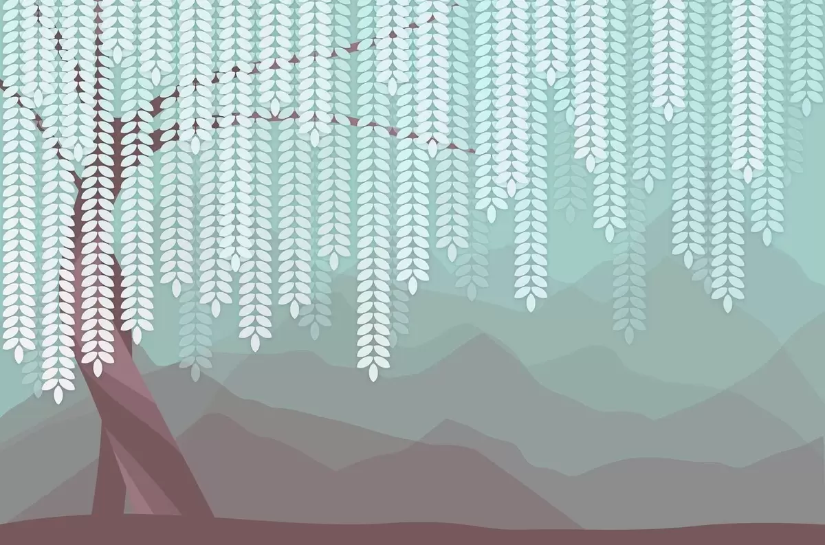 Fotomurales Árbol de sauce estilizado con hojas colgantes sobre un fondo de montañas minimalistas en tonos chocolate y turquesa. Nr. w05232v1