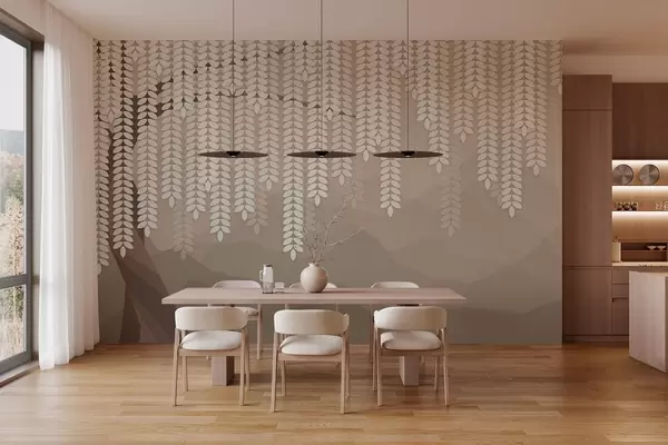 Fotomurales Sauce estilizado con hojas colgantes sobre un fondo de montañas minimalistas en tonos café. Nr. w05232v2