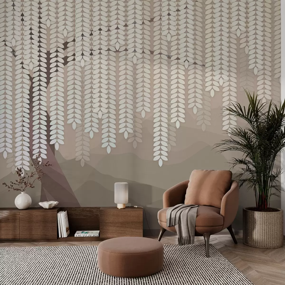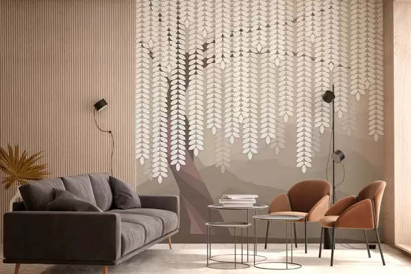 Fotomurales Sauce estilizado con hojas colgantes sobre un fondo de montañas minimalistas en tonos café. Nr. w05232v2