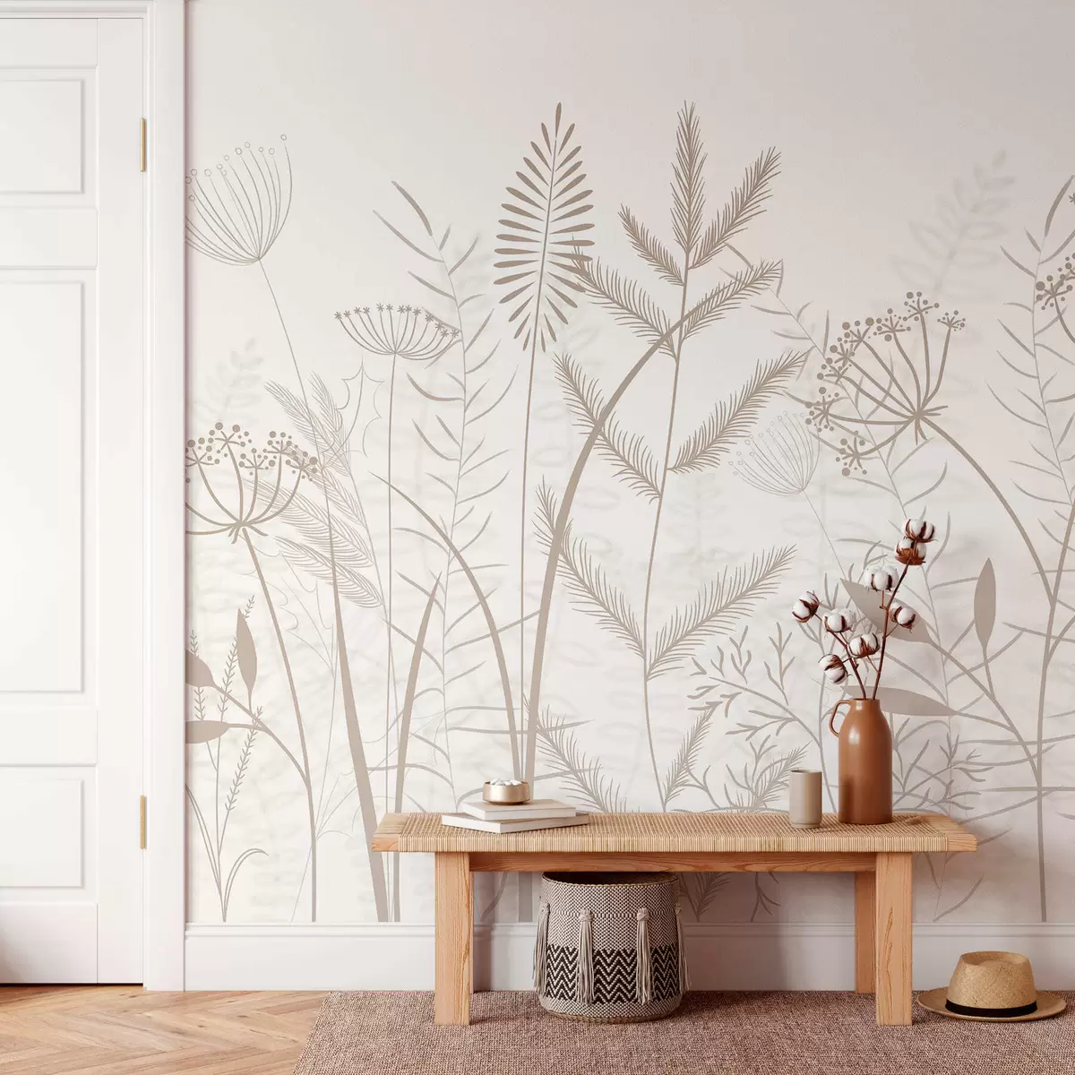 Fotomurales delicadas hierbas silvestres y flores pintadas a mano sobre un fondo blanco Nr. w05383v2