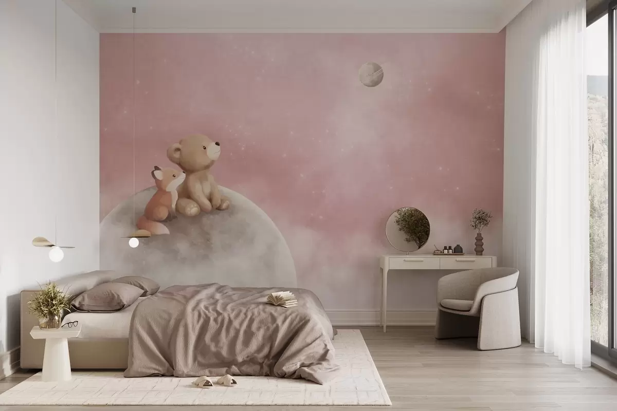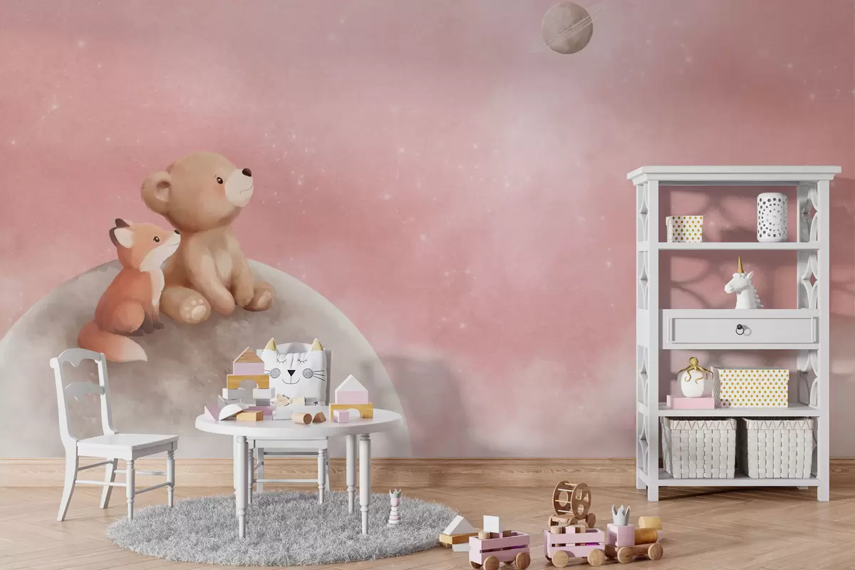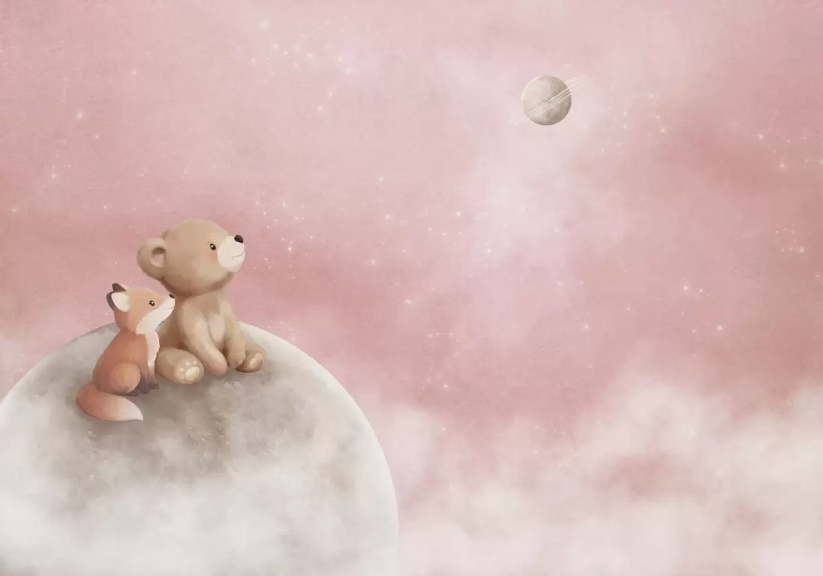 Fotomurales Ilustración al pastel de un oso y un zorro bajo un cielo rosa con la luna Nr. w05431v2