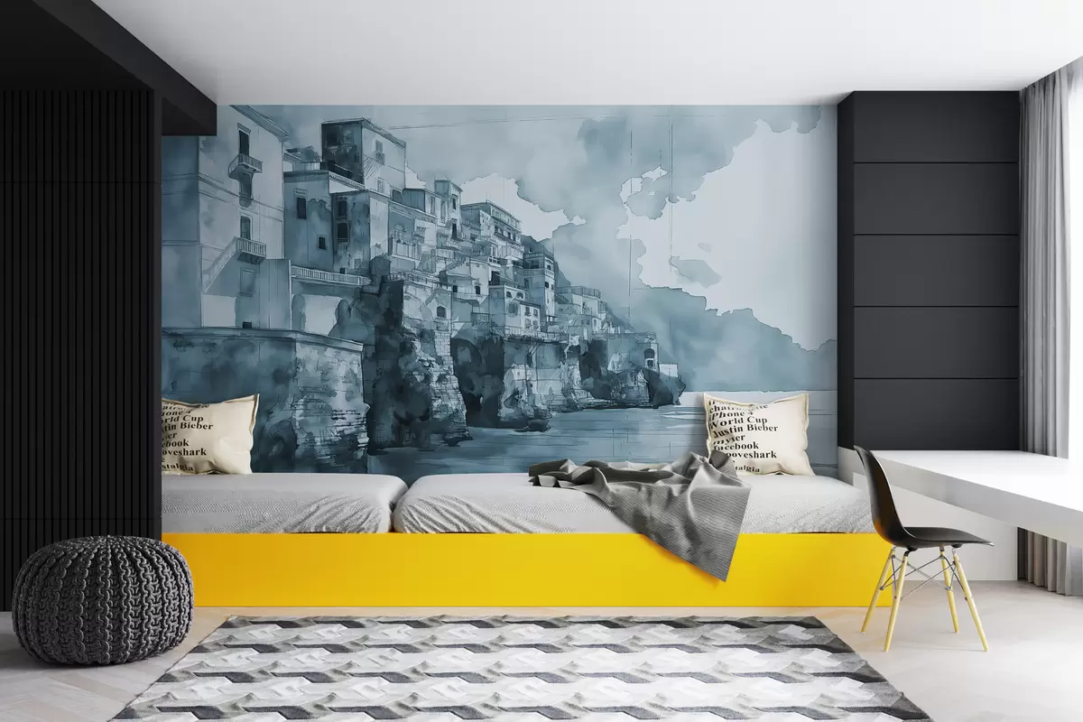 Fotomurales Ciudad acuarela pintada sobre el agua en tonos azules. Nr. w07879