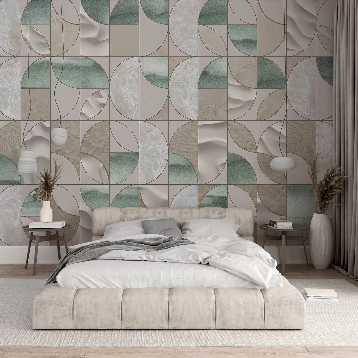 Fotomurales Un patrón geométrico de texturas verdes, beige y blancas dispuestas en un diseño abstracto repetitivo Nr. w07928