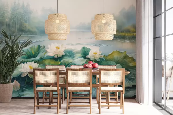 Fotomurales Nenúfares, lago del bosque, dibujo acrílico, naturaleza, colores verde y blanco. Nr. w07957