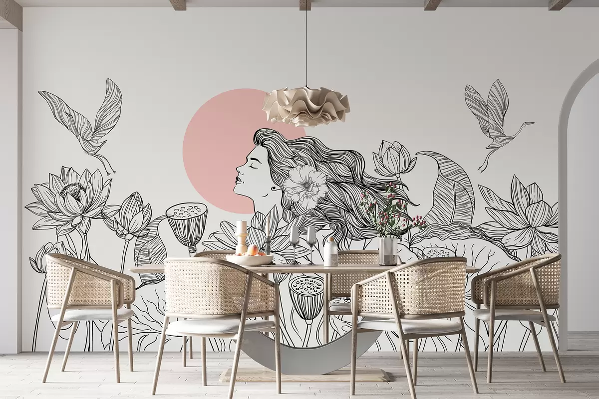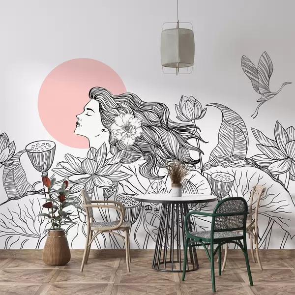 Fotomurales Mujer en la naturaleza, dibujo lineal, flores de loto, hojas grandes, pájaros voladores, color negro y rosa Nr. w07988v5