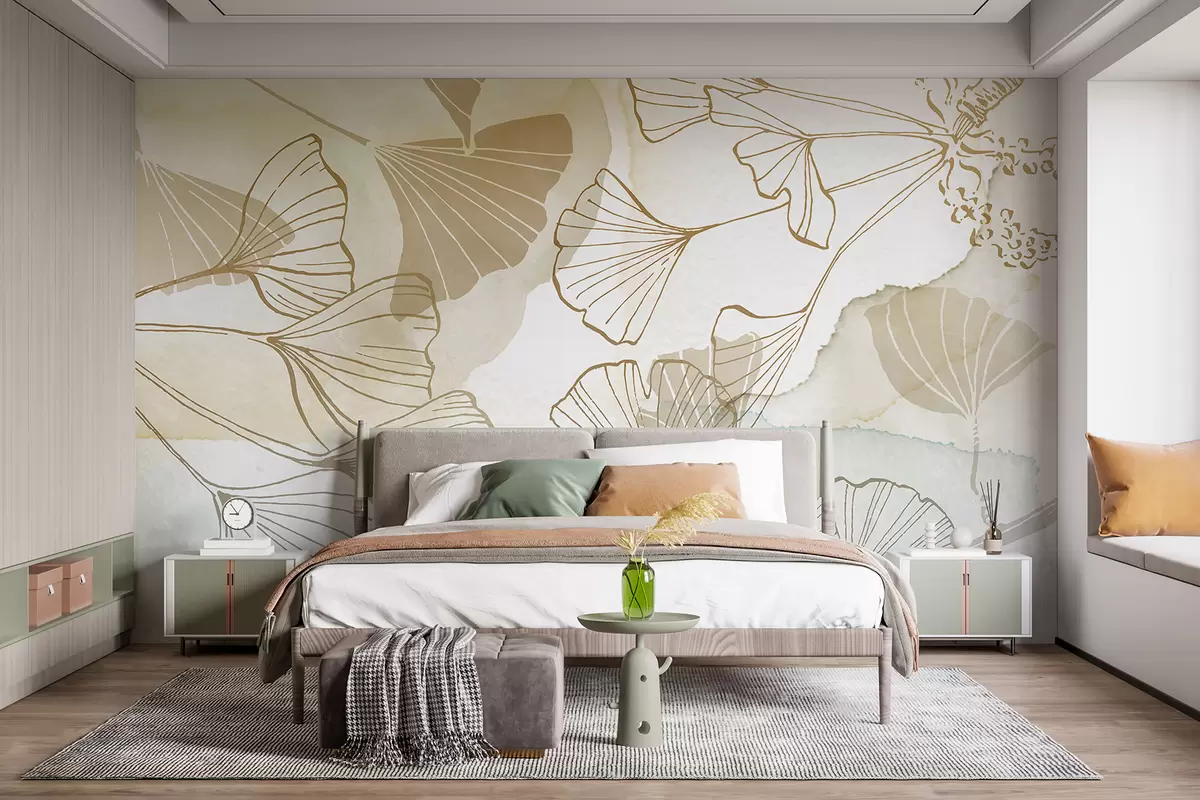Fotomurales Un patrón de delicadas hojas de ginkgo en tonos beige, tostado y azul sobre un fondo claro. Nr. w08157