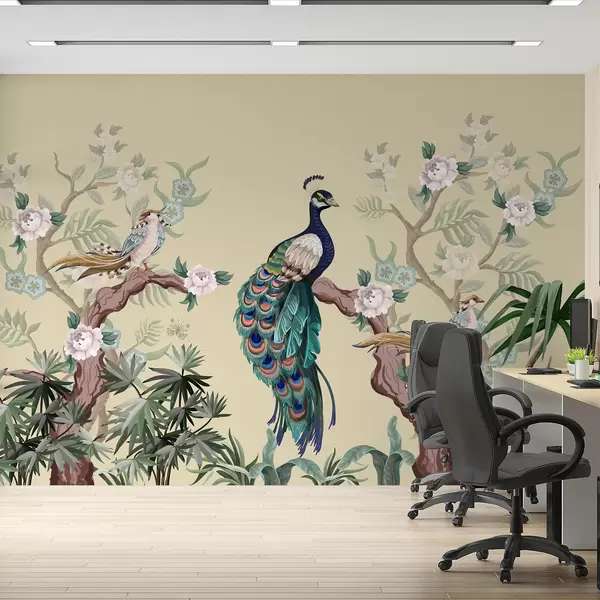 Fotomurales pavo real sobre un árbol, fondo beige Nr. w08168