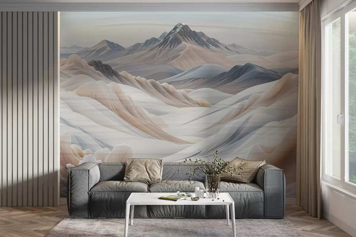 Fotomurales Impresión de paisaje montañoso con picos nevados en tonos beige de estética minimalista. Nr. w08191