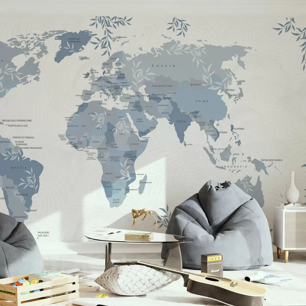 Fotomurales Mapa del mundo elegante con hojas y plantas de color azul. Nr. w08211v4