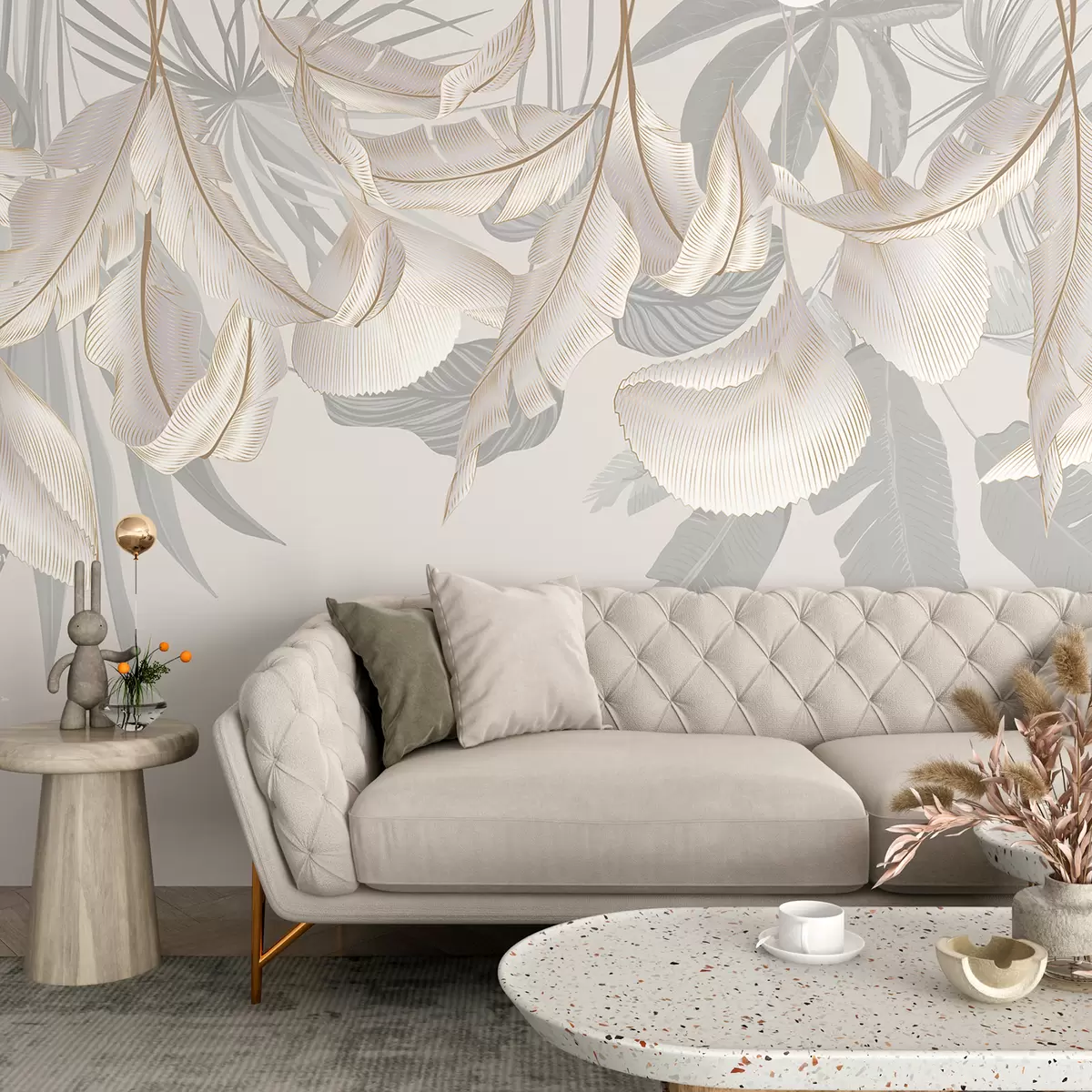 Fotomurales Delicadas hojas tropicales florales blancas y grises que crean un fondo suave y etéreo. Nr. w08217