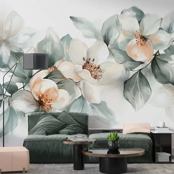 Fotomurales Delicadas flores de magnolia blancas y rosas con hojas verdes suaves sobre un fondo claro. Nr. w08220