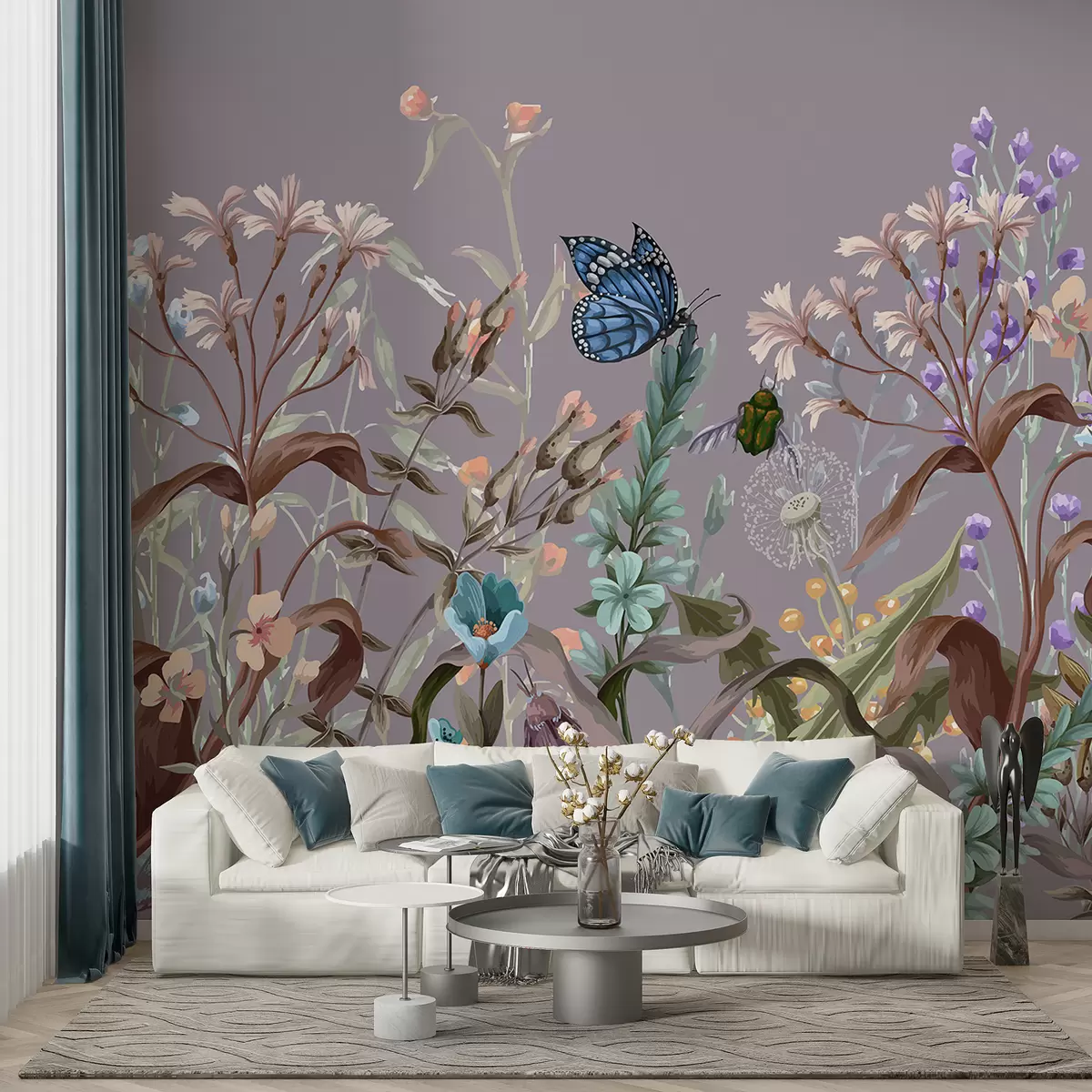 Fotomurales Una colorida ilustración violeta de una escena de jardín exuberante y florido con insectos en un estilo fantástico y onírico. Nr. w08234v1
