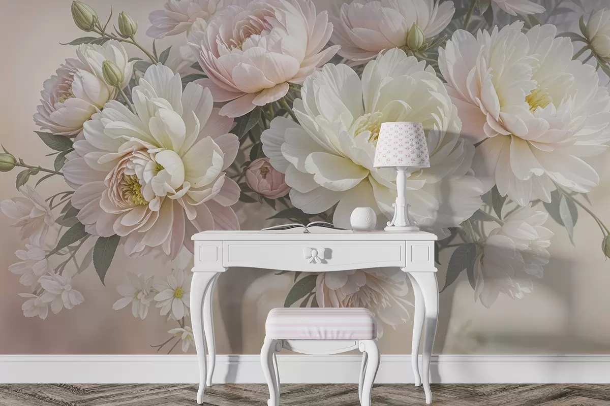 Fotomurales Un ramo de exuberantes peonías de colores pastel y otras flores sobre un fondo suave y difuminado Nr. w08276