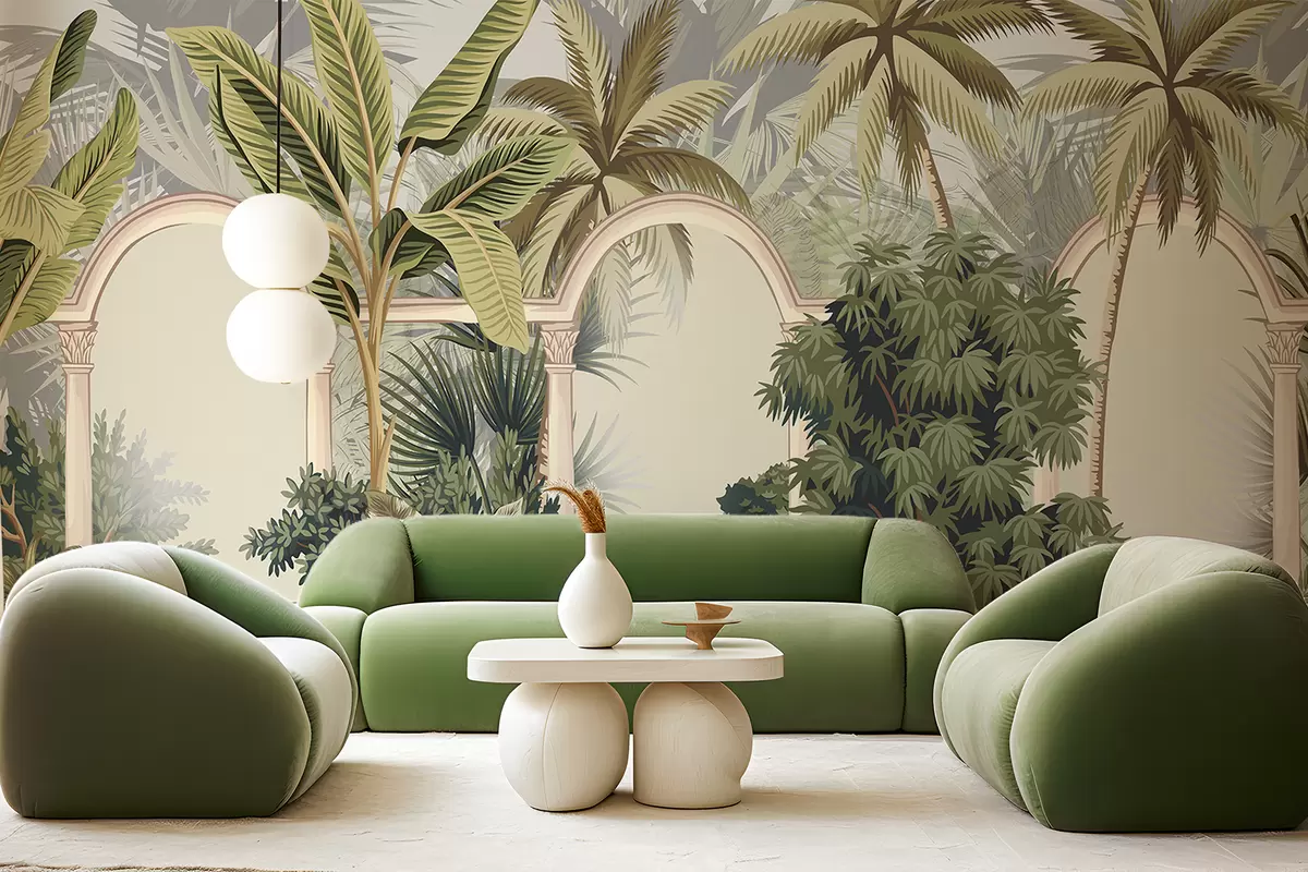 Fotomurales Arcos con paisaje tropical, exuberantes palmeras y otros follajes sobre un fondo claro Nr. w08306