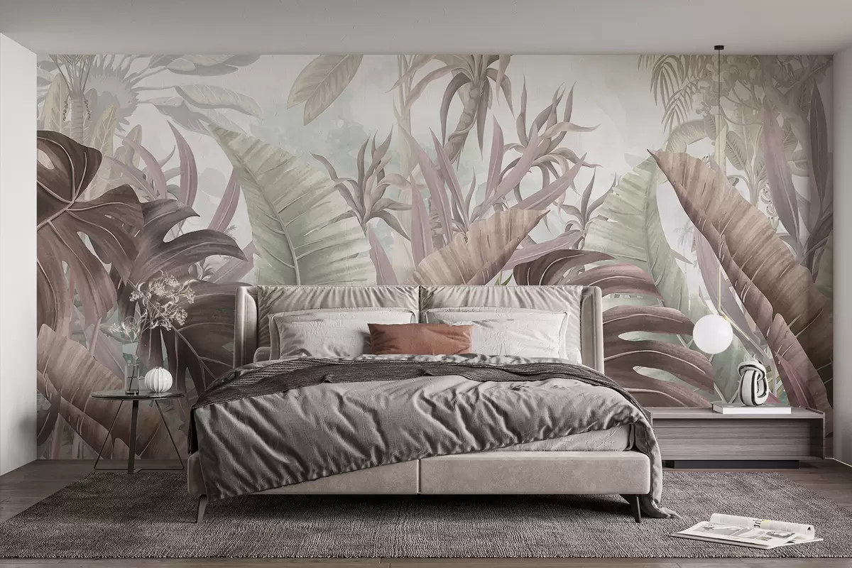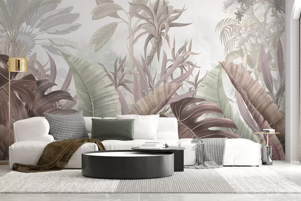 Fotomurales Una jungla tropical con grandes hojas de palmera y plantas exóticas en tonos grises, blancos y beige Nr. w08307