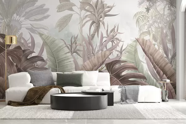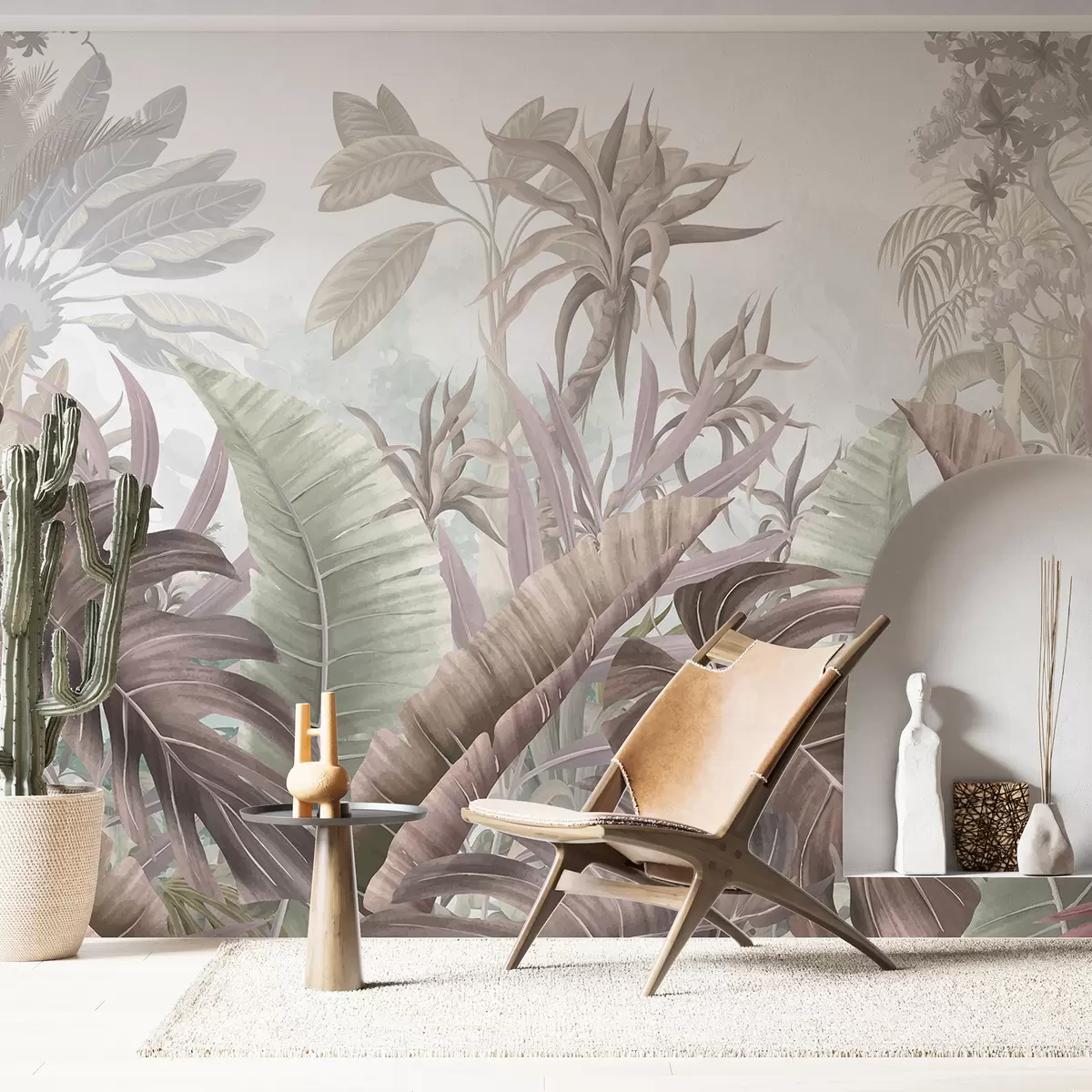 Fotomurales Una jungla tropical con grandes hojas de palmera y plantas exóticas en tonos grises, blancos y beige Nr. w08307