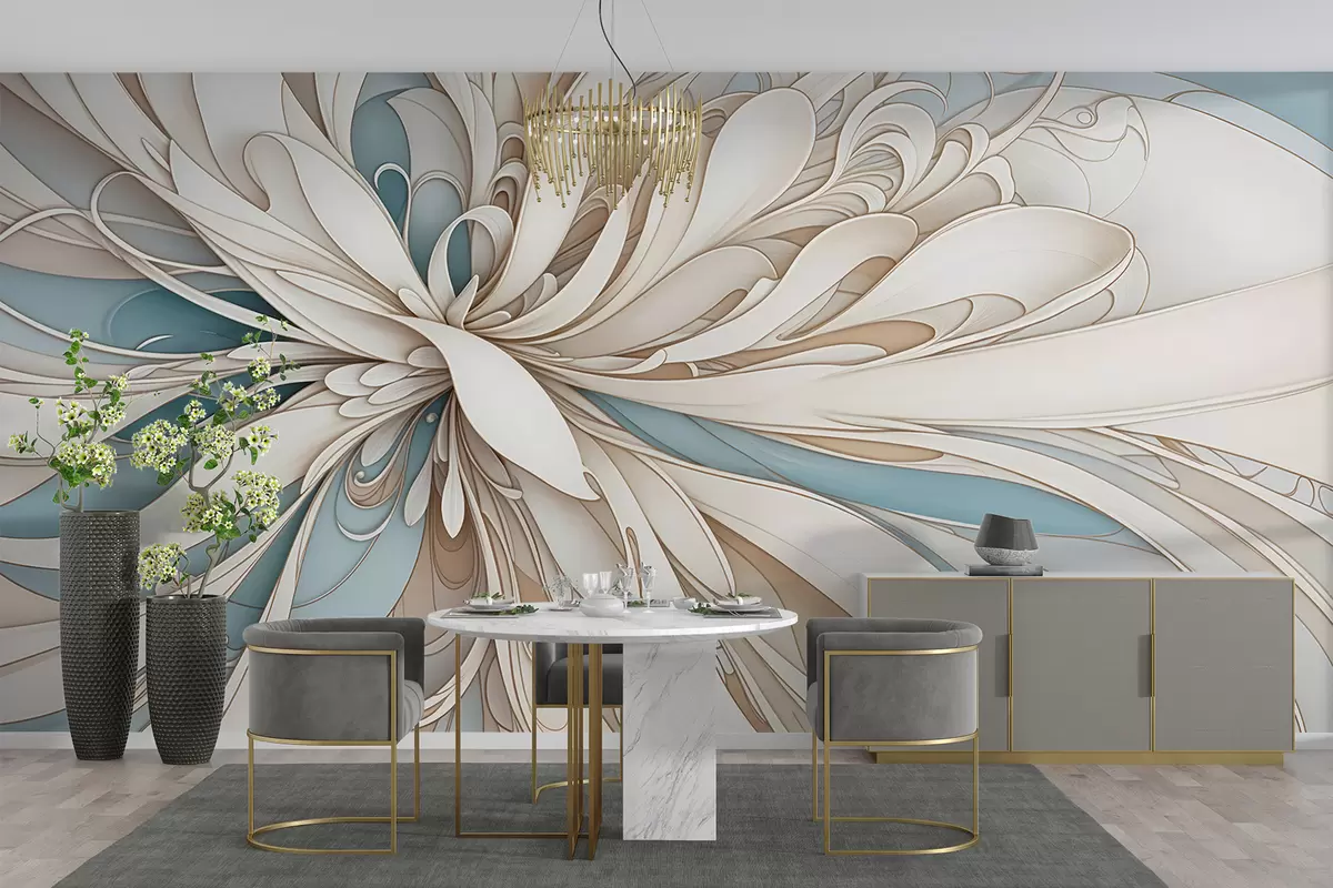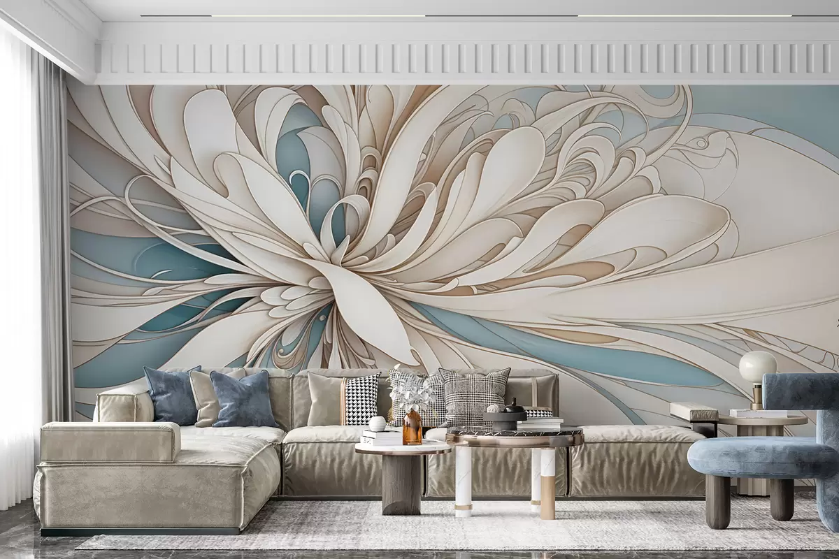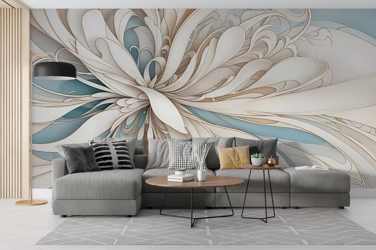 Fotomurales Estampado floral abstracto con formas orgánicas arremolinadas en tonos beige, tostado y azul con un fondo claro Nr. w08311