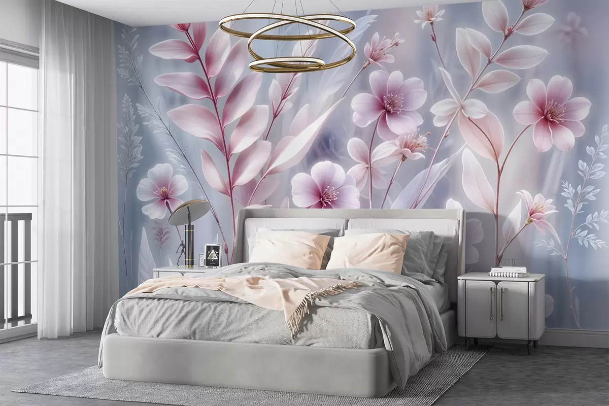 Fotomurales Delicadas flores rosas con suaves pétalos y hojas sobre un fondo abstracto gris pálido Nr. w08323
