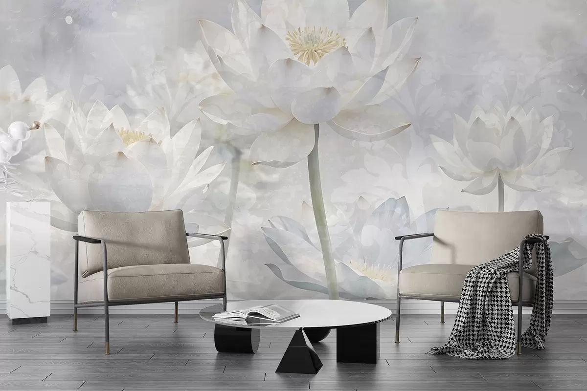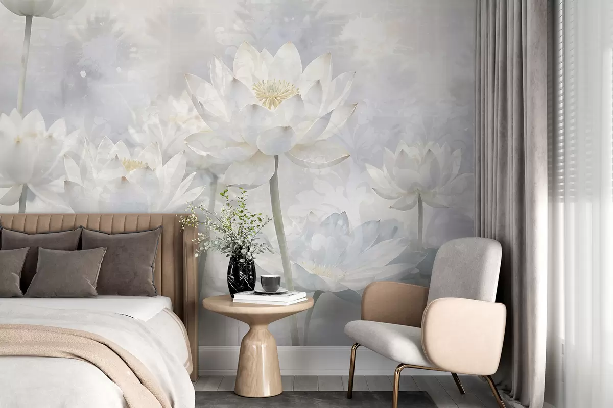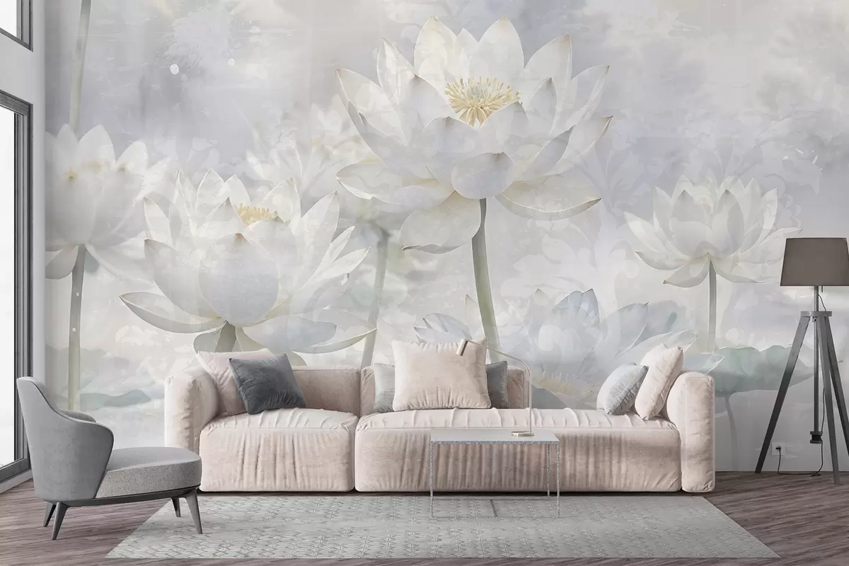 Fotomurales Flores de loto blancas en un etéreo fondo de paisaje abstracto en colores pastel Nr. w08328