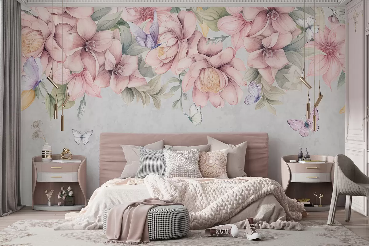 Fotomurales Suaves flores rosas y blancas con delicadas flores y hojas sobre fondo gris texturizado Nr. w08331