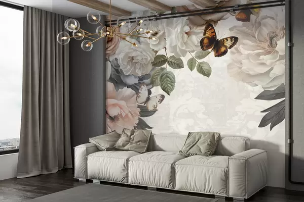 Fotomurales Grandes flores de peonía blancas y rosas con una mariposa posada en una de las flores sobre un fondo suave y difuminado Nr. w08340