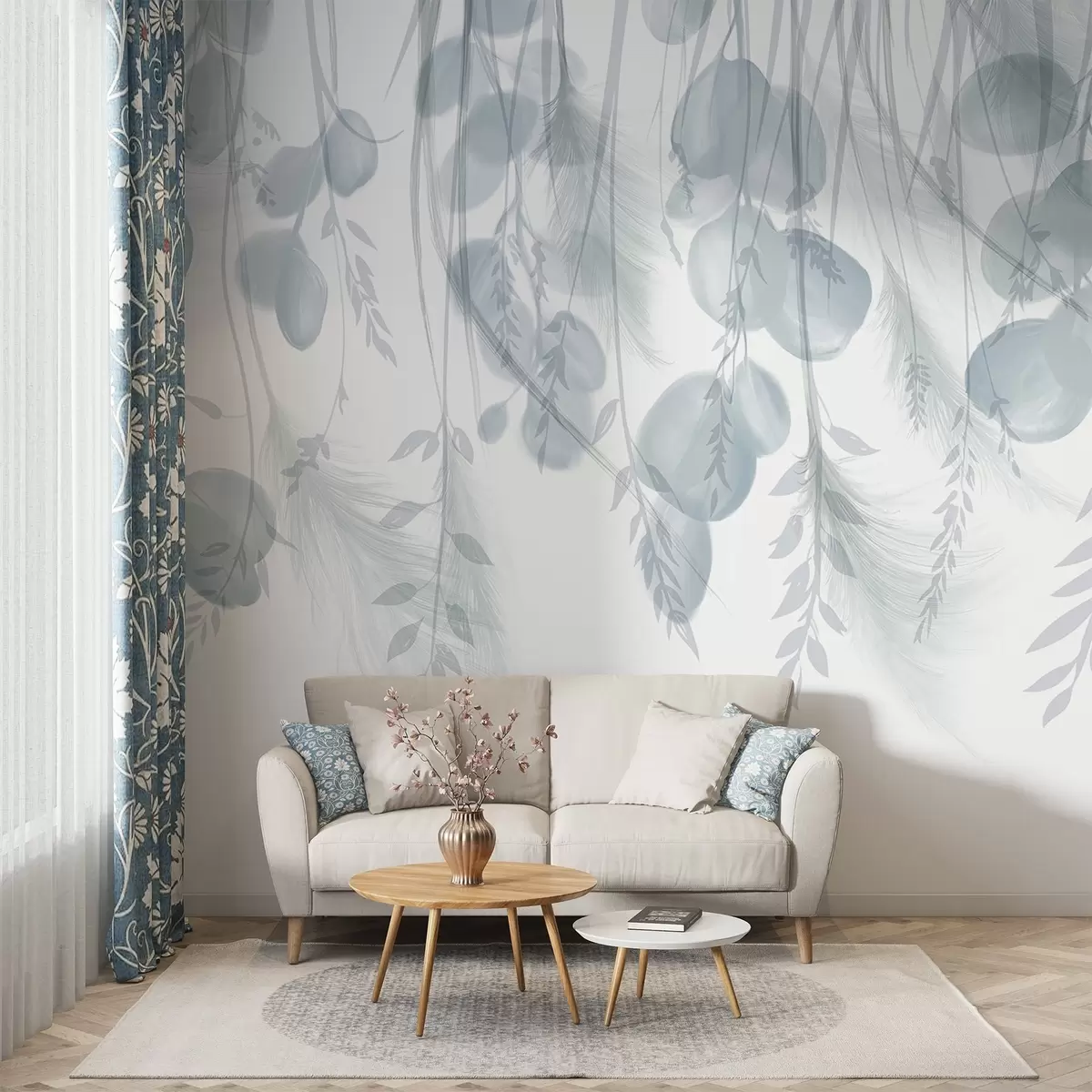 Fotomurales Delicadas hojas de eucalipto grises y verde pastel cayendo, creando una atmósfera serena y tranquilizadora Nr. w08380