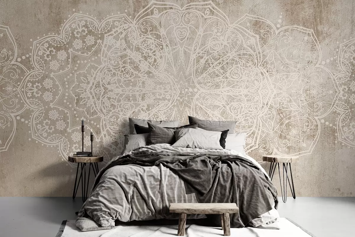Fotomurales Un detallado e intrincado dibujo de mandala de encaje blanco sobre un fondo de pared de color marrón beige con textura de loft Nr. w08387v1