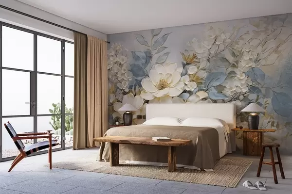 Fotomurales Grandes flores blancas y amarillo pálido con hojas gris verdosas sobre un fondo suave y difuminado Nr. w08404