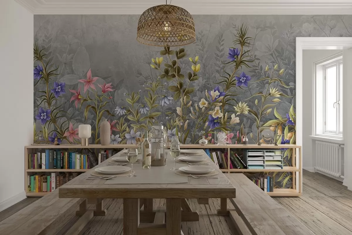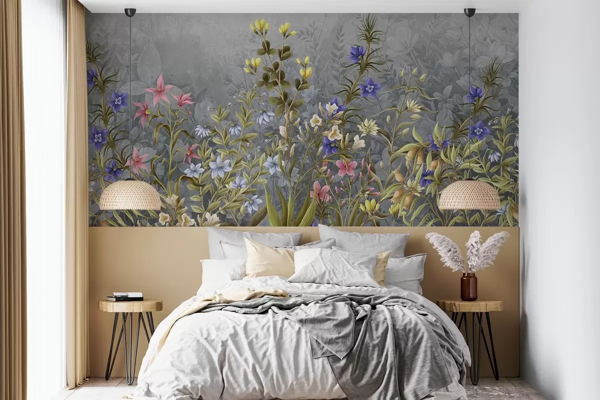 Fotomurales Un exuberante y vibrante estampado de texturas florales con coloridas flores y plantas con intrincados detalles y texturas Nr. w08428v1