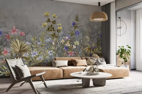 Fotomurales Un exuberante y vibrante estampado de texturas florales con coloridas flores y plantas con intrincados detalles y texturas Nr. w08428v1