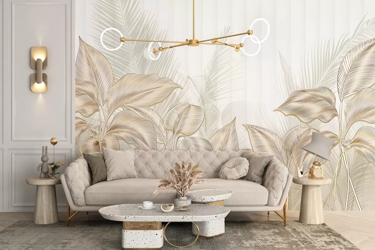 Fotomurales Elegantes hojas de palmera blancas y beige sobre un fondo claro y texturizado Nr. w08434