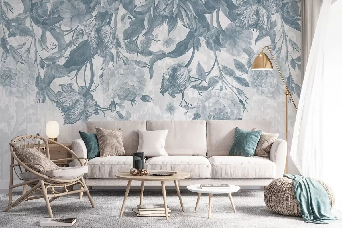 Fotomurales Un exuberante arreglo floral con grandes flores azules y blancas, con hojas y tallos en azul pastel Nr. w08435v1