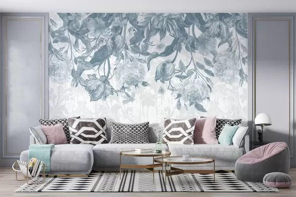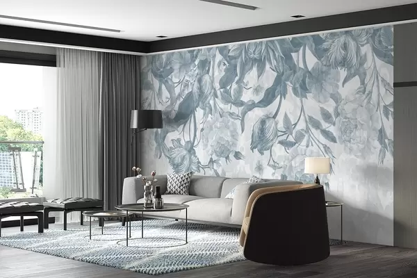 Fotomurales Un exuberante arreglo floral con grandes flores azules y blancas, con hojas y tallos en azul pastel Nr. w08435v1