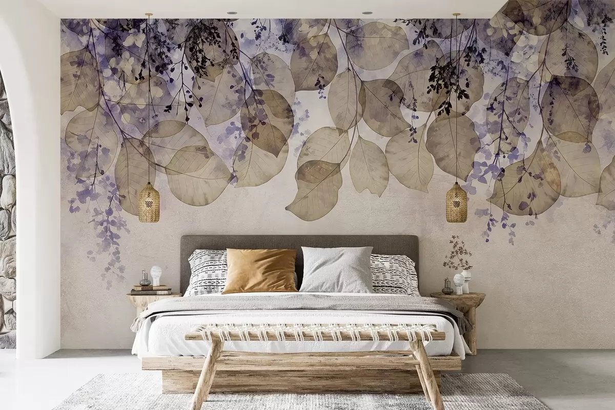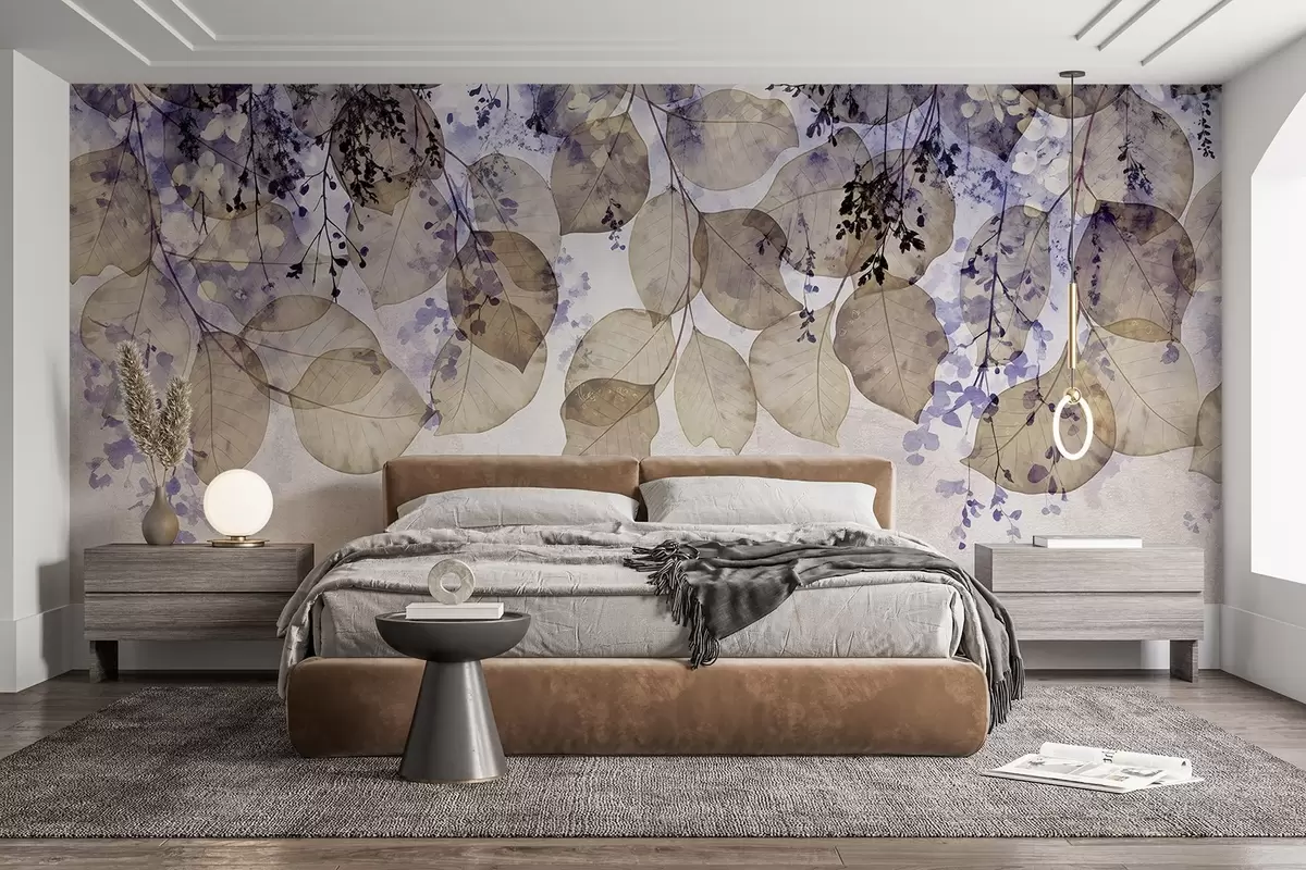 Fotomurales Delicadas hojas secas y flores en tonos púrpura, beige y blanco sobre un fondo de textura ligera Nr. w08447