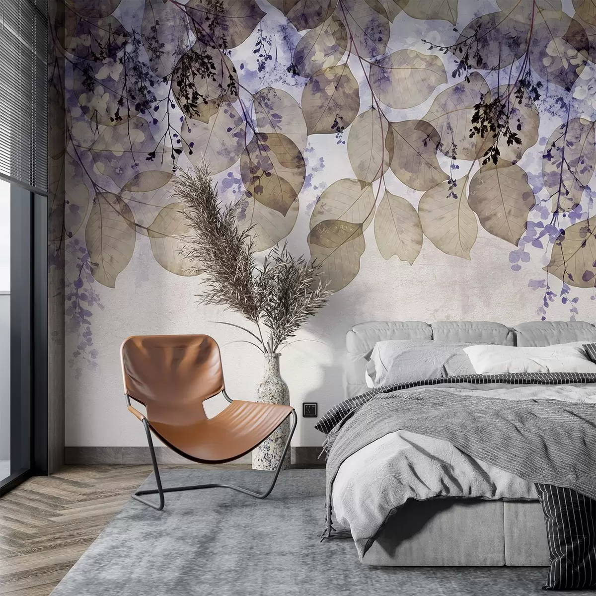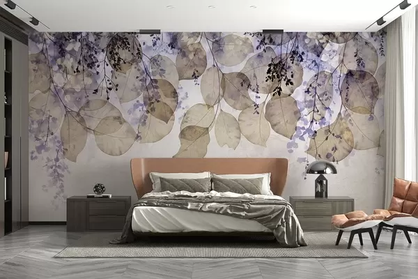 Fotomurales Delicadas hojas secas y flores en tonos púrpura, beige y blanco sobre un fondo de textura ligera Nr. w08447