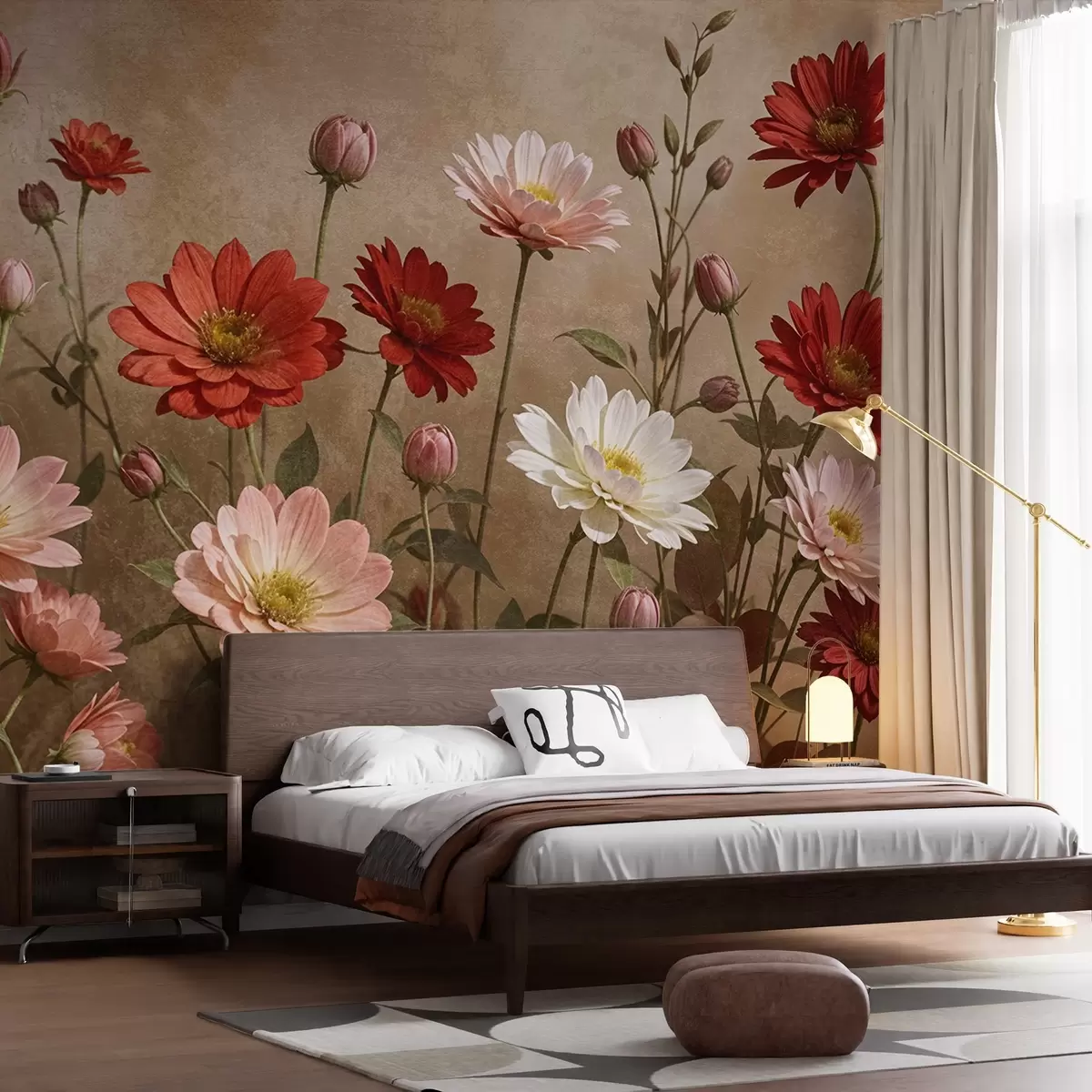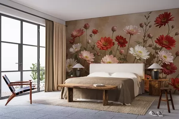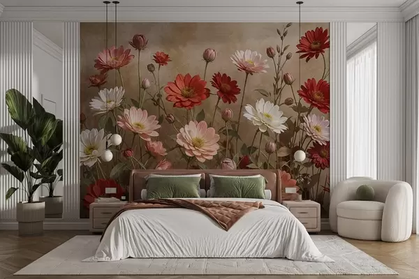 Fotomurales Un campo de coloridas flores parecidas a margaritas en varios tonos de rosa, rojo y blanco sobre un fondo texturizado Nr. w08462