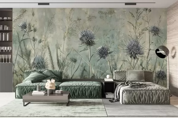 Fotomurales Un campo de flores de cardo púrpura con flores borrosas y follaje en el fondo de textura vintage Nr. w08463