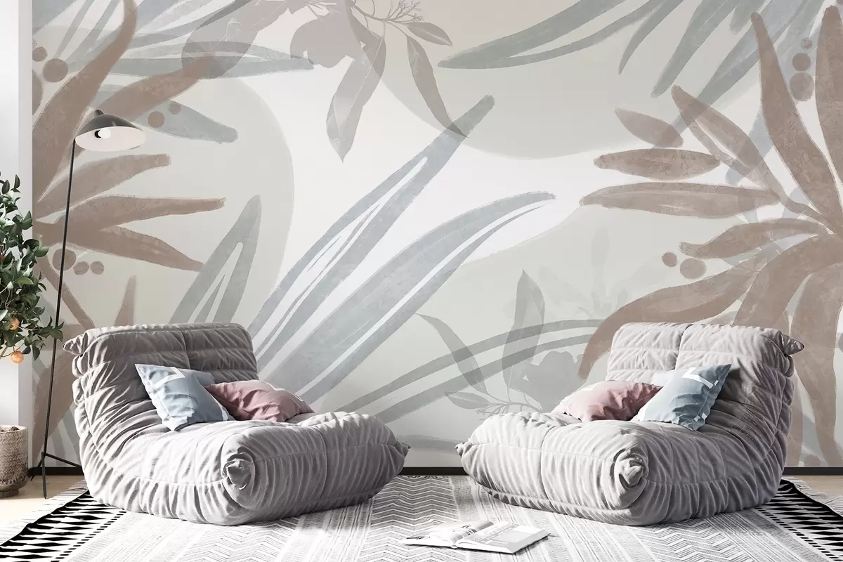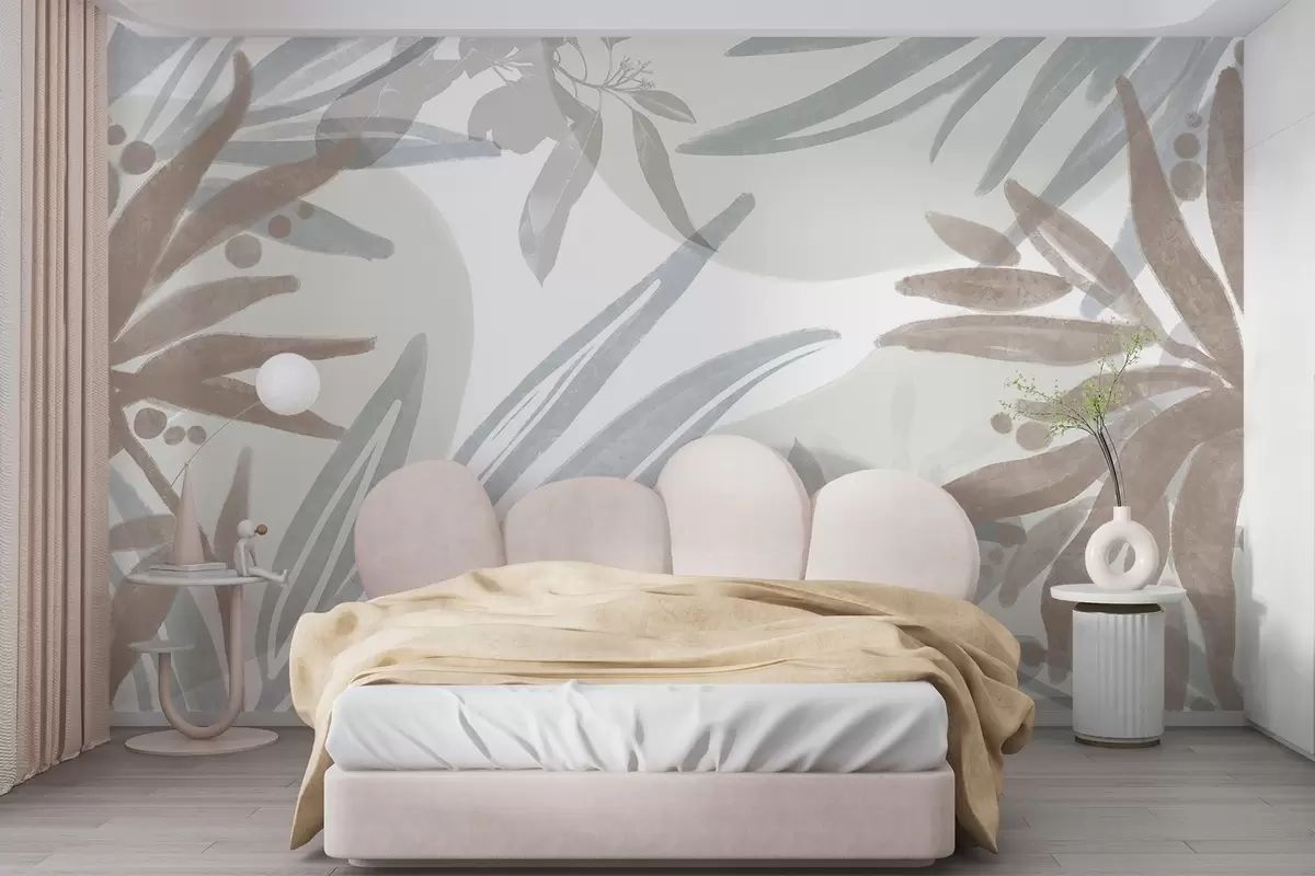 Fotomurales Un motivo floral abstracto de tonos neutros con hojas y formas superpuestas en tonos grises, blancos y beige Nr. w08464