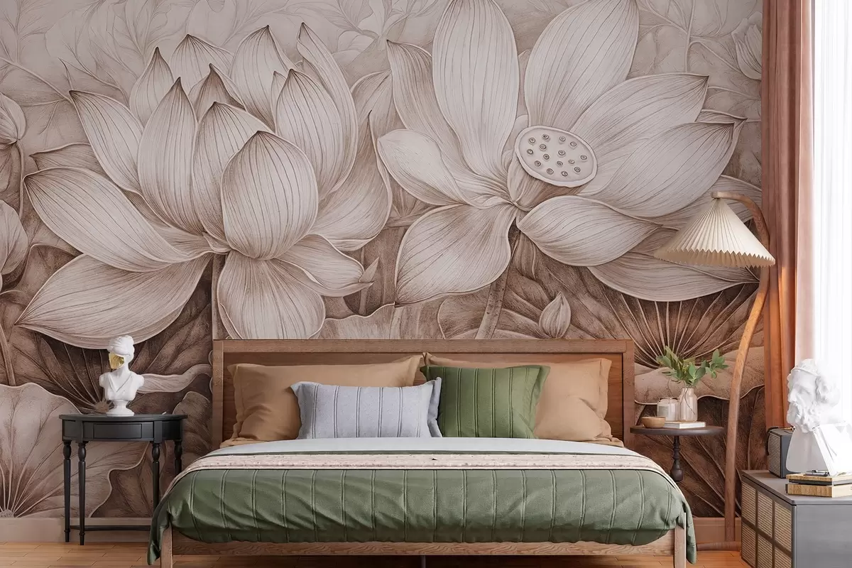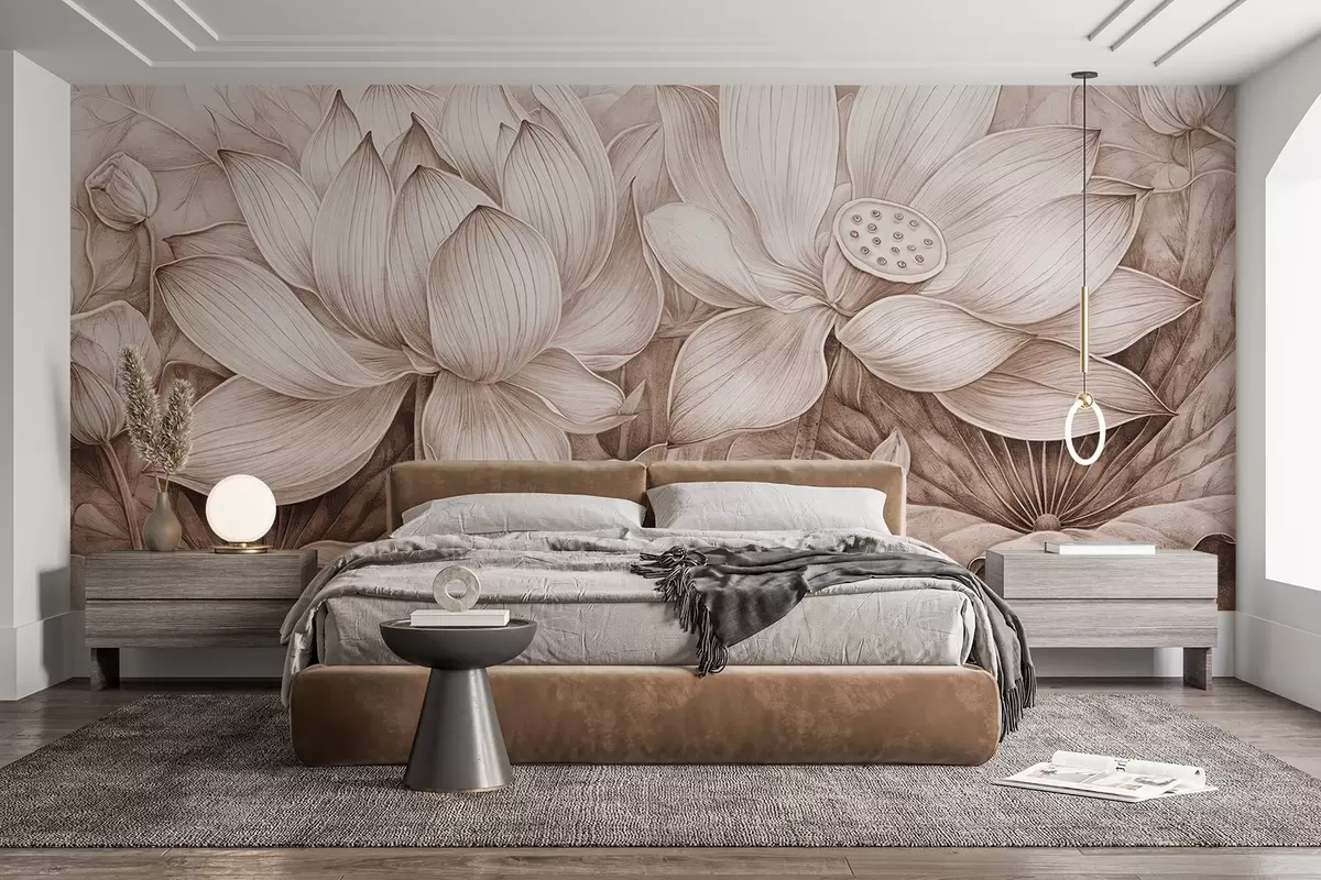 Fotomurales Varias flores grandes de loto beige con textura detallada y hojas y tallos marrones sobre fondo claro Nr. w08465v1