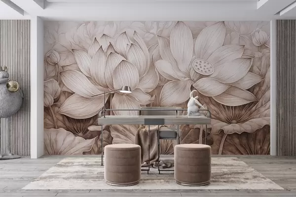 Fotomurales Varias flores grandes de loto beige con textura detallada y hojas y tallos marrones sobre fondo claro Nr. w08465v1