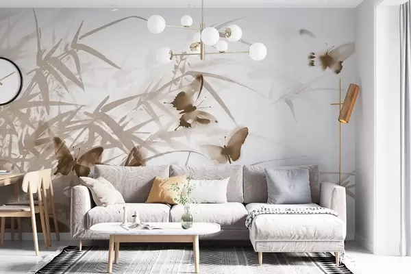 Fotomurales Texturas de hojas y tallos de bambú con mariposas marrones voladoras de alas transparentes Nr. w08524v1