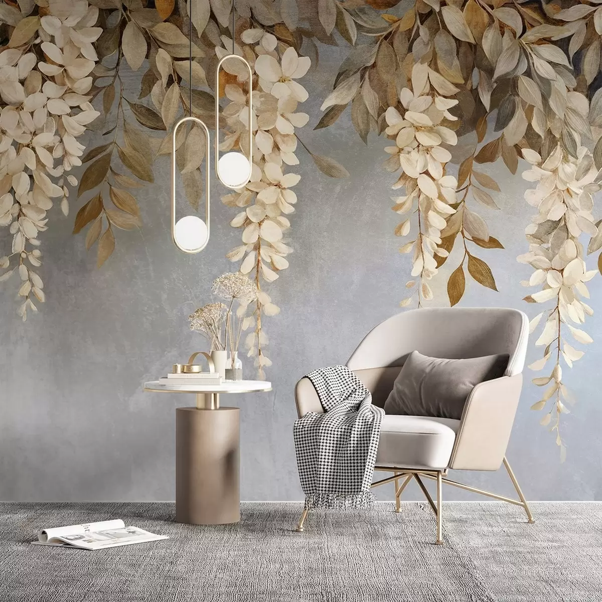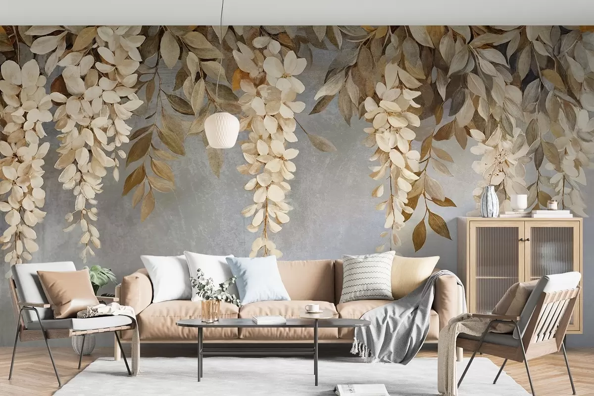 murales de pared Delicadas flores de glicinia blancas y beige claro con follaje en cascada sobre un fondo gris suave w08531