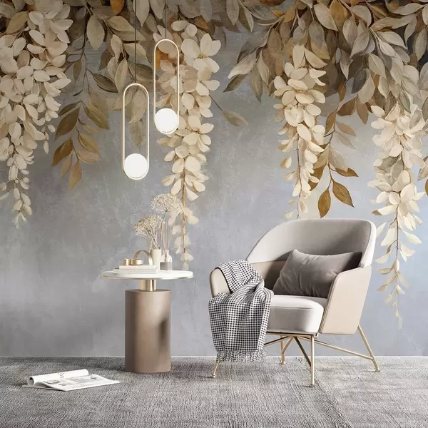 Fotomurales Delicadas flores de glicinia blancas y beige claro con follaje en cascada sobre un fondo gris suave Nr. w08531
