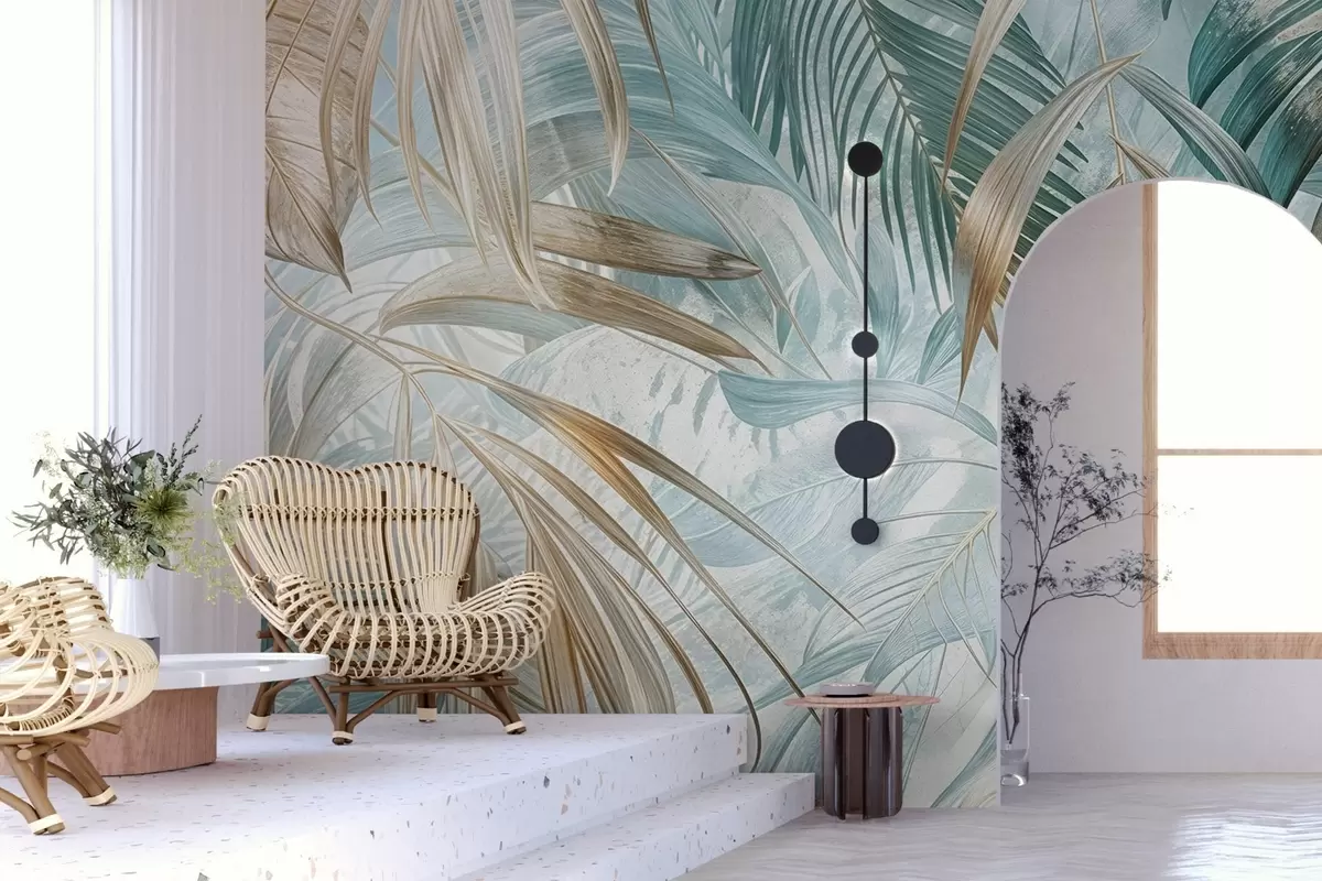 Fotomurales Un estampado floral abstracto tropical con grandes hojas de palmera en tonos azules y beige crea un ambiente exuberante Nr. w08532