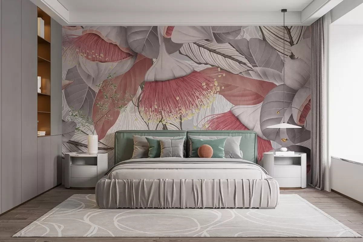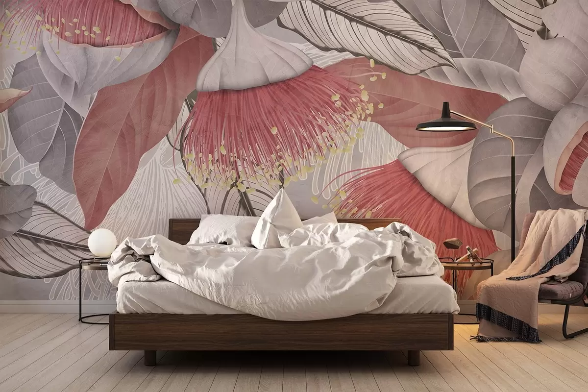 Fotomurales Ilustración botánica de grandes flores de eucalipto con largos estambres sobre fondo gris y blanco Nr. w08539