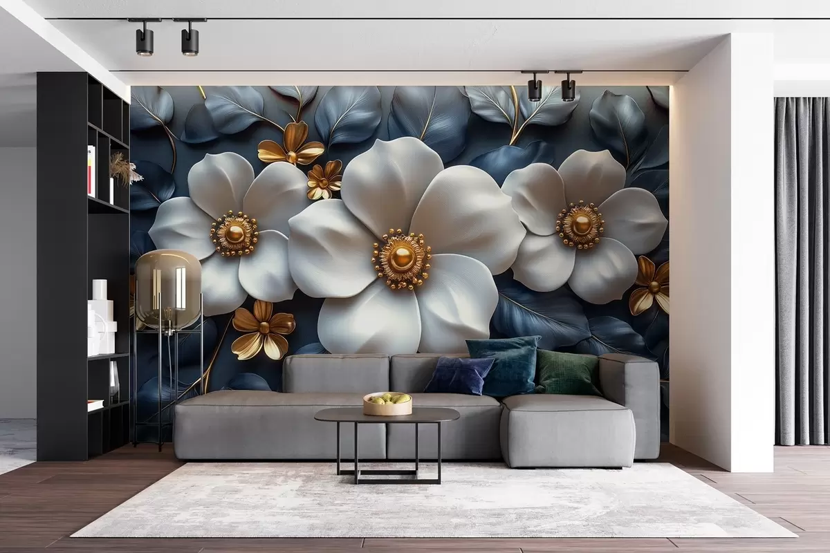 Fotomurales Grandes flores blancas sobre un elegante fondo azul con hojas Nr. w08559