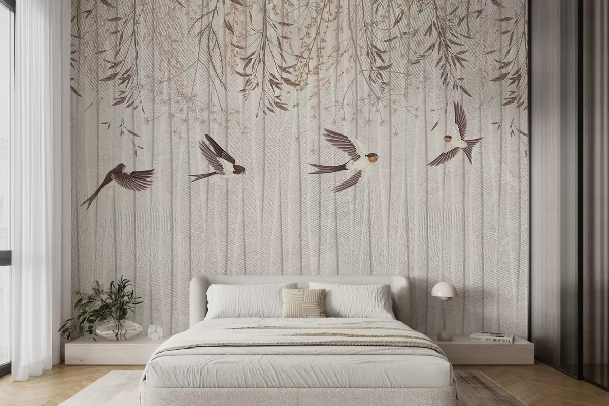 Fotomurales Pájaros volando sobre un fondo texturizado con dientes de león y flores Nr. w08566