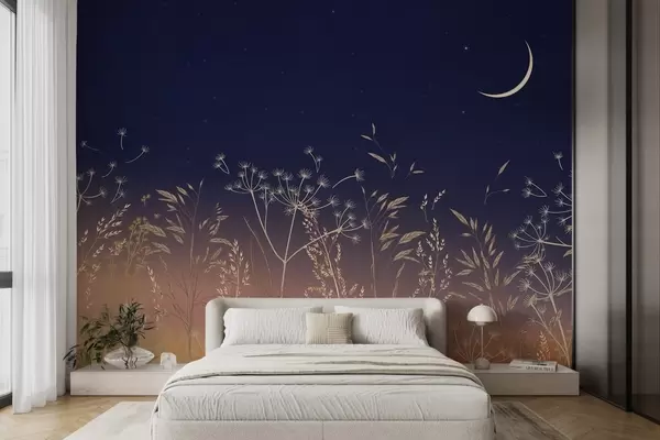 Fotomurales Dientes de león con flores silvestres sobre un fondo de puesta de sol con un cielo azul y la luna Nr. w08567