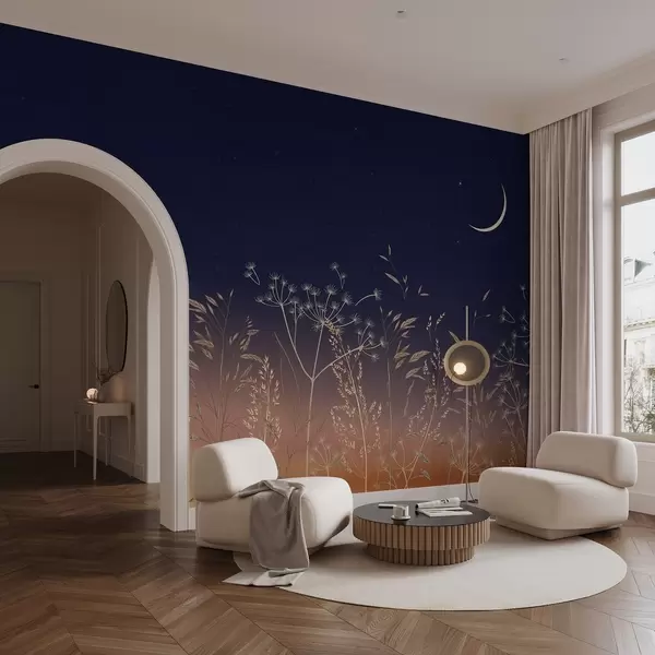Fotomurales Dientes de león con flores silvestres sobre un fondo de puesta de sol con un cielo azul y la luna Nr. w08567