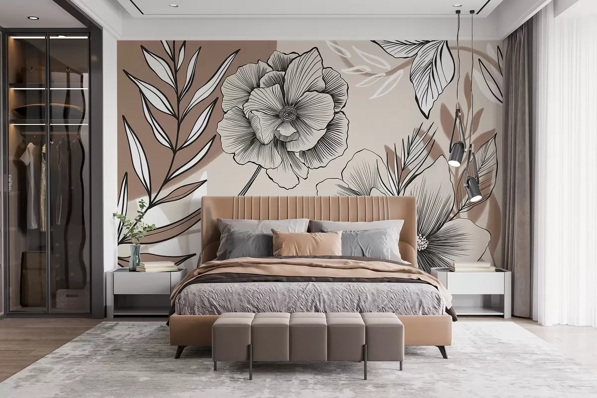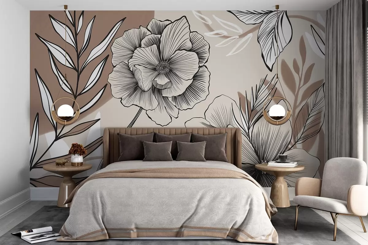Fotomurales Grandes flores gráficas en blanco y negro con hojas detalladas sobre un fondo abstracto beige Nr. w08580